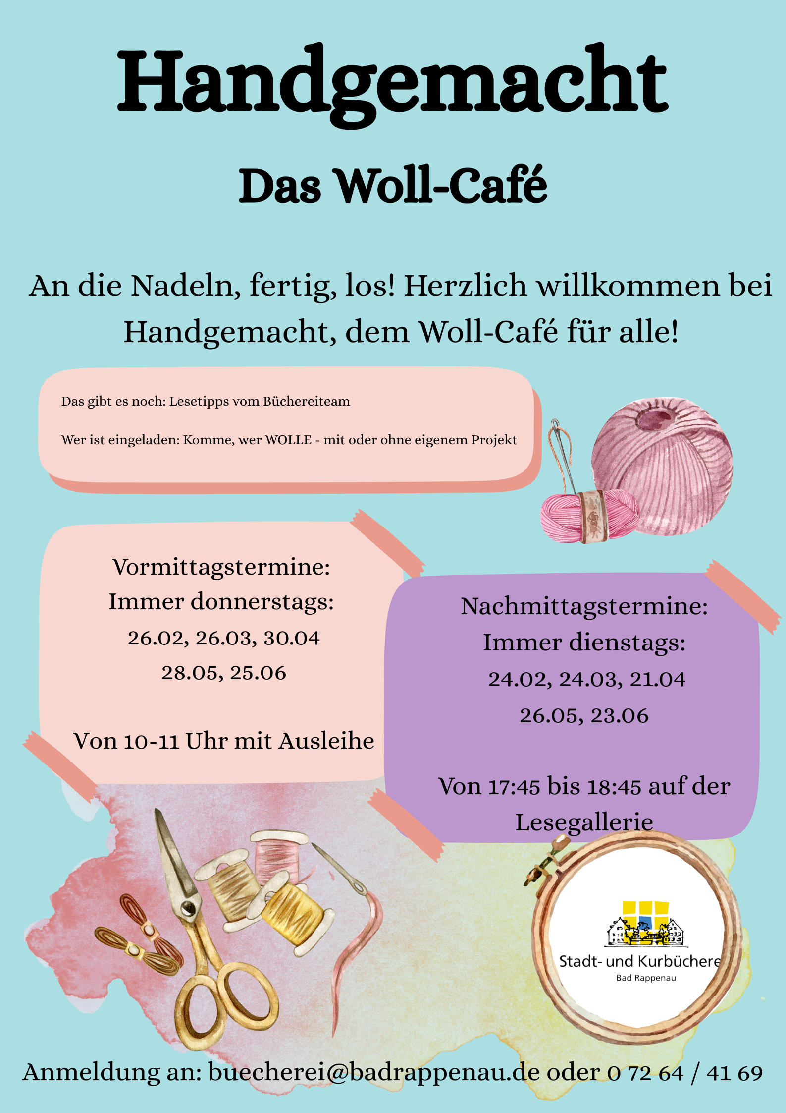 „Nur noch eine Reihe!“ Wem dieser Satz schon über die Lippen ging, ist richtig bei „Handgemacht – das Woll-Café“. Das neue Angebot der Stadt- und Kurbücherei ist kostenlos und richtet sich an alle Menschen, die gerne häkeln, stricken oder auf andere Art kreativ sind. Interessierte können eigene Projekte mitbringen und vor Ort gemeinsam in gemütlicher Atmosphäre an diesen arbeiten. Auch wer kein Woll-Projekt hat und sich bei Kaffee oder Tee gerne unterhält oder einfach dabei sein möchte, ist willkommen.