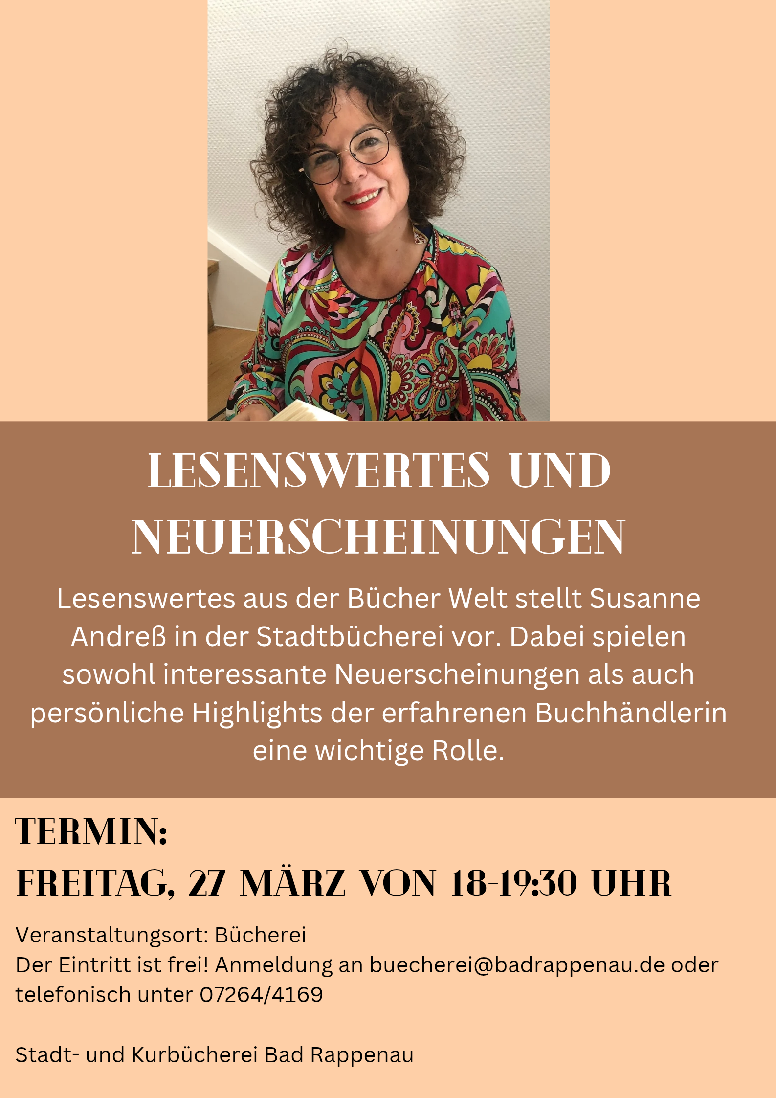 Der Eintritt ist frei! Wir bitten um Anmeldung per Mail an buecherei@badrappenau.de oder telefonisch unter 07264/4169.