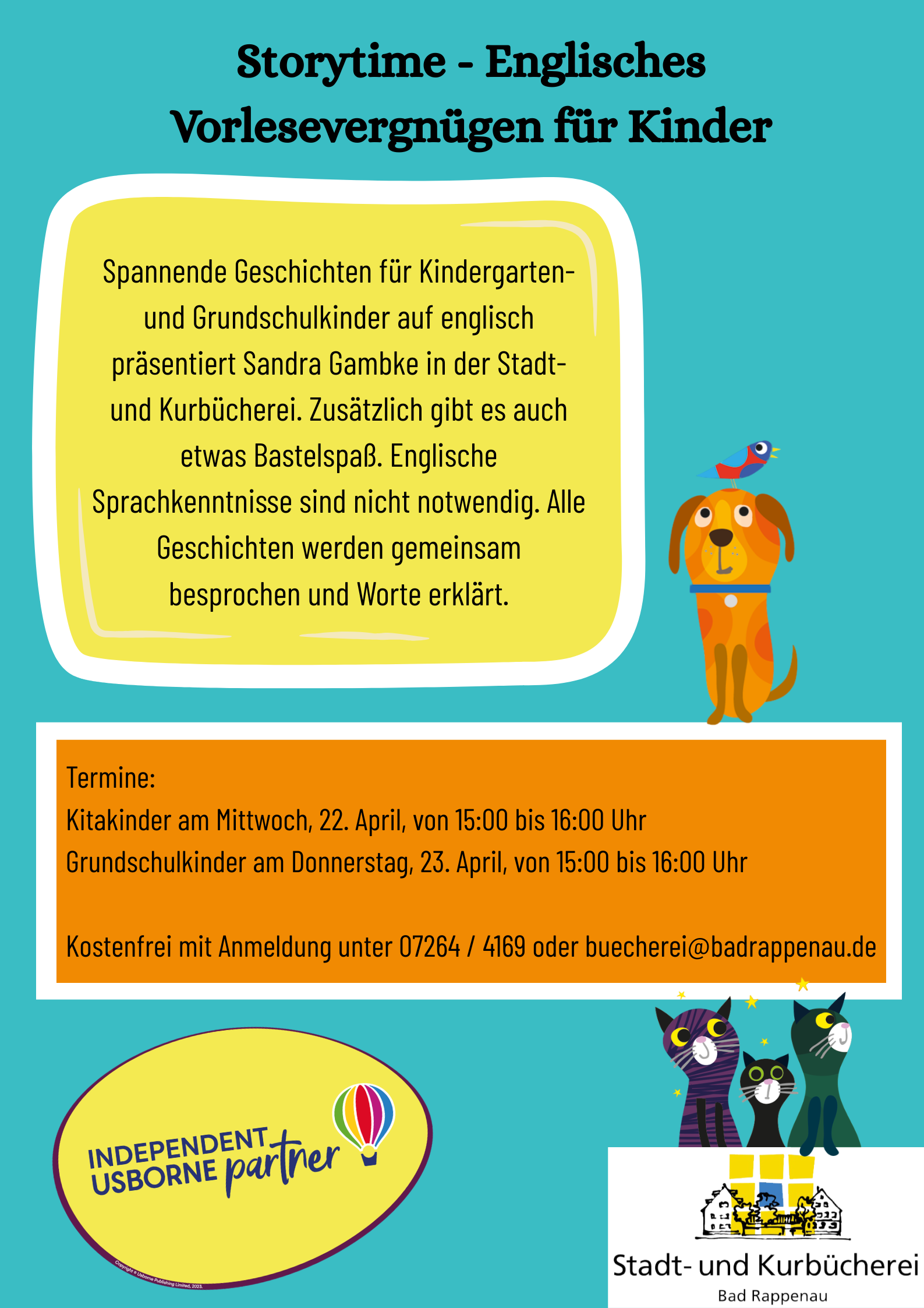 Spannende Geschichten für Kindergarten- und Grundschulkinder auf Englisch präsentiert Sandra Gambke in der Stadt- und Kurbücherei. Zusätzlich gibt es auch etwas Bastelspaß. Englische Sprachkenntnisse sind nicht notwendig. Alle Geschichten werden gemeinsam besprochen und Worte erklärt